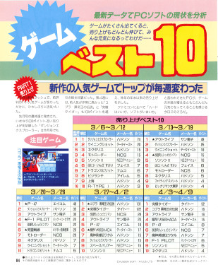 The charts are the result of obtaining cooperation from prominent nationwide department stores and toy stores, with the editorial department, based on the numbers of titles sold, aggregating them in a unique way. (Feb. 1991, p. 57; minor variations appeared in other issues) 表中のポイントは、複数の調査対象店から得た各ソフトの売り上げ本数に、一定の係数を掛けて算出したものです。