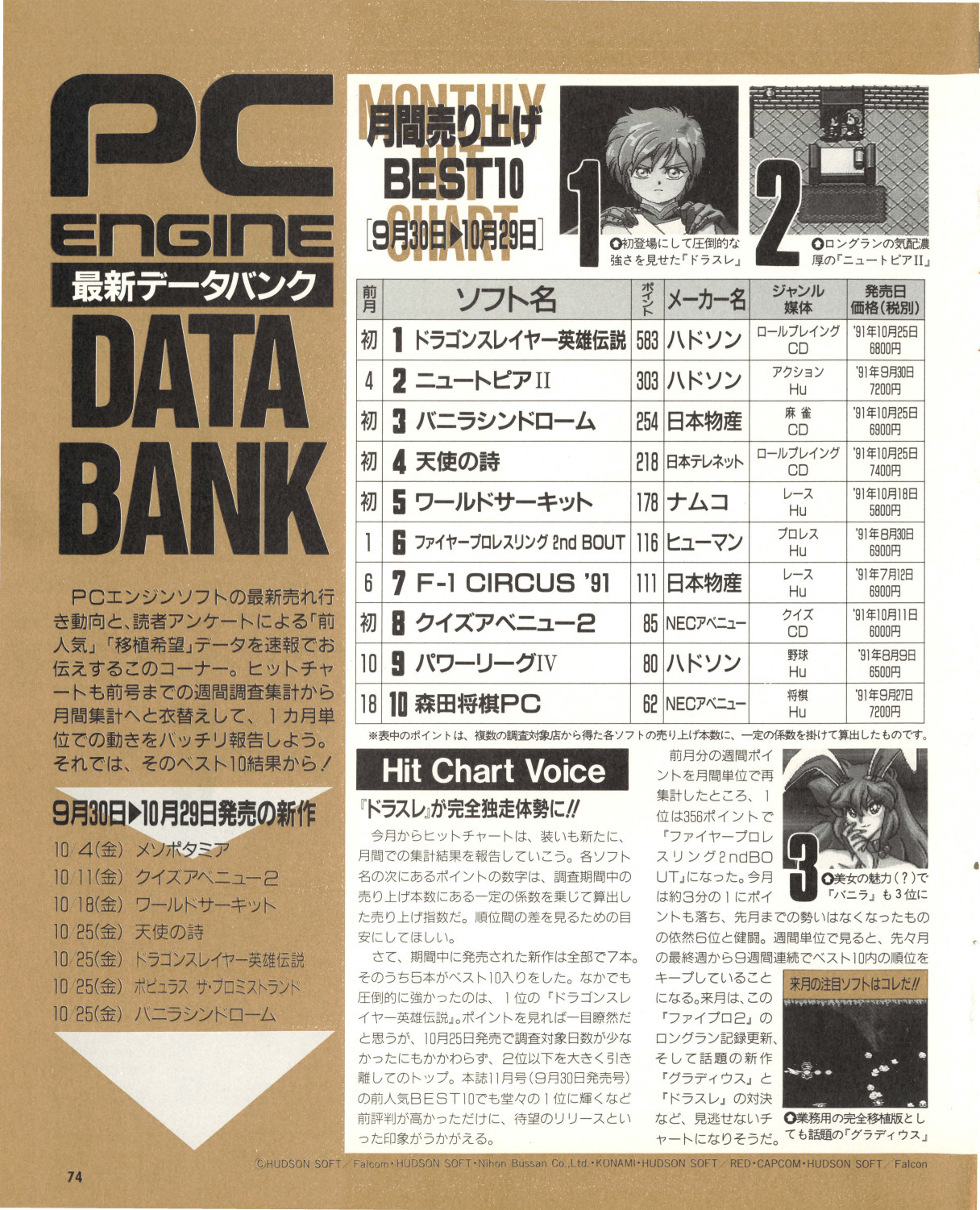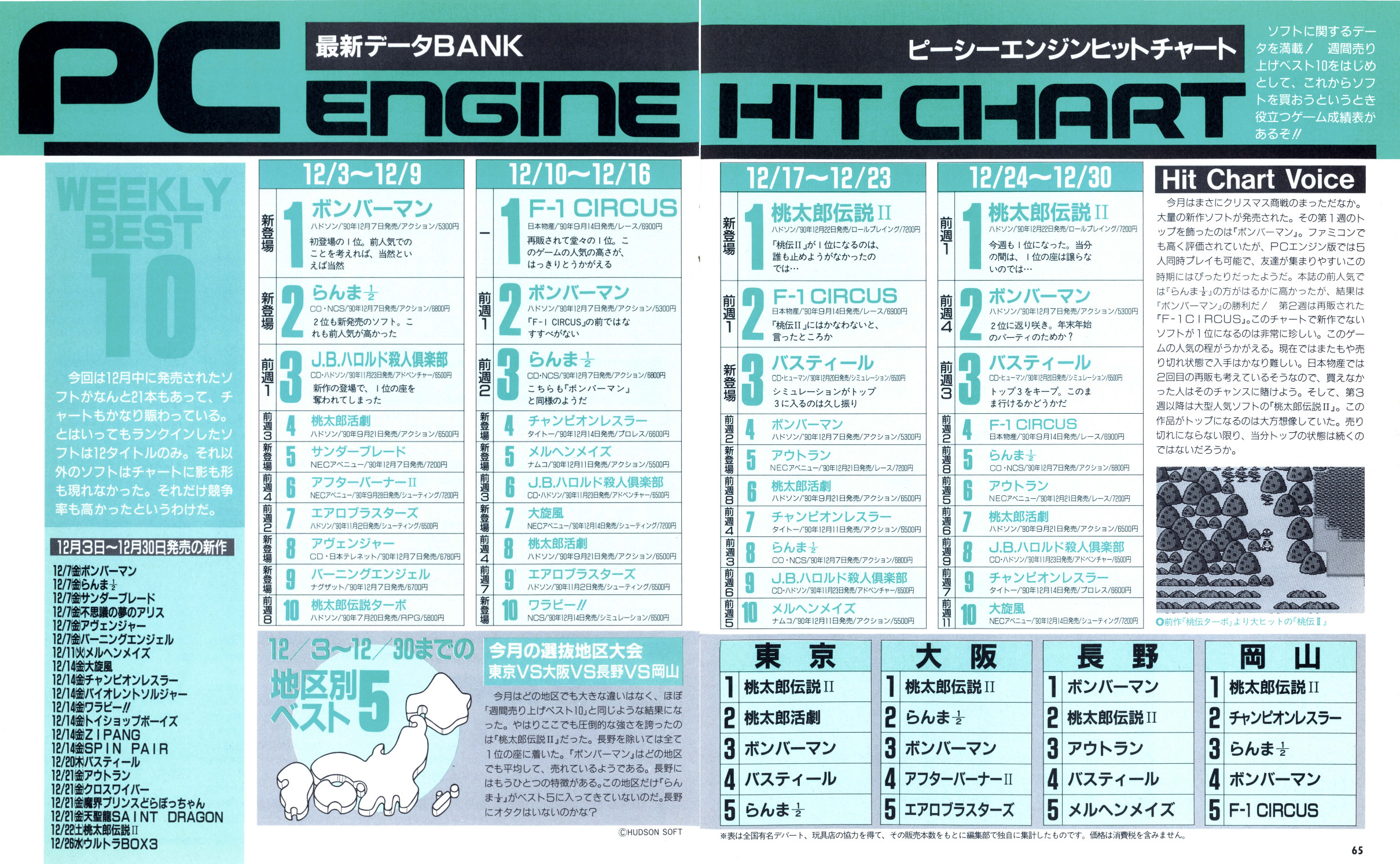 PC Engine Fan Magazine Data CollectionAbout PC Engine FanPC Engine Fan was a Japanese monthly magazine published by Tokuma Shoten Intermedia from December 1988 to October 1996, dedicated, as you might gather from the name, to all things PC-Engine. Each month featured extensive coverage of freshly released and upcoming games, cheat codes and game guides, prize giveaways, reader-submitted reviews and letters to the editor, game sales charts, and usually a lot of discussion of vaguely game-adjacent topics like anime and voice actors to fill out the page count. PC Engine Fan was just one of several major PC-Engine–related magazines, such as Shougakukan's Gekkan PC Engine and Kadokawa Shoten's Marukatsu PC Engine. However, unlike its competitors, it has the distinct advantage to the modern reader that someone has actually gone to the trouble of scanning in all the issues and making them available online, meaning it's possible to read it in its entirety without having to track down a bunch of random decades-old magazines through Japanese auction sites. Infinite thanks to Hubz for providing these scans! Since someone went to so much effort to make the magazine available, I thought it'd be nice to do something with it, so I've put together these pages to aggregate the game sales data originally published in PC Engine Fan in an organized, searchable fashion. Unfortunately, as the rest of this page is largely dedicated to explaining, much of this data defies organization. I had fun trying, though. The DatabaseThere are two components to this database: the game list and the sales charts. Game ListThe game list is a sortable index of games and their chart scores. It can be used to view only games released during a particular period, or to filter sales data to a certain time span, and in fact it's highly advisable that you do this due to changes in the magazine's methodology over time (see the "Problems" section below). Each game's entry includes a breakdown of its appearances in the sales charts, with links to the corresponding charts. As explained below, the magazine stopped listing point scores at one point before resuming later on. Games which appeared in the charts during that period have those scores listed as "???" and their overall score as "+???," since a number of games would otherwise be listed as having 0 points. If a game isn't in the database, it never appeared in a sales chart. Sales ChartsThe sales charts are more or less a recreation of the chart data from the magazine. Though the original charts only list the top 10 games, a game that was outside the top 10 in one chart but rose to within it in the next one would usually, though not always, have that previous position indicated on the chart (e.g. "#6 this month, previously #17"). In the interest of providing as much information as possible, I've added in these "implied" entries to the charts. Game titles are generally written exactly as they appeared in the magazine's charts, so Seiya Monogatari, for instance, is listed under that title only, without the Anearth Fantasy Stories subtitle. If a game's title was inconsistent across charts, I arbitrarily picked one form or another. I mostly matched the transliterated titles with those used by Redump and No-Intro, though occasionally I disagreed with them about something. Official localizations have been ignored. Reissued verisons of games are listed separately from the originals (when I noticed them, anyway). For most of the magazine's run, games were assigned sequential ranks from 1–10, even if some of them had tied points. For the last couple of years or so (and the July 1989 issue, for some reason), this was changed so that tied games were assigned the same rank. I've simply copied the ranks as they originally appeared in each issue. The magazine's charts sometimes contained errors, which range from minor typos (such as the June 1991 issue claiming that Manhole costs "65007 yen") to, in one case, listing a game with more points as having a lower rank than one with fewer (Bomberman and Sol Moonarge in the April 1995 issue's chart). I've corrected the issues that I noticed, but there are most likely more that I missed. Please let me know if you spot any errors, either on my part or the magazine's. If you'd like to play with this data beyond the capabilities I've provided, feel free to download the raw spreadsheets for the sales charts and the game database. The Sales ChartsPC Engine Fan first began publishing game sales charts from its second issue (January 1989). As the magazine ran for nearly eight years, it's little surprise that the formatting of the charts changed over time. The basic concept remained mostly the same: each issue contained a Top 10 list in which the ten best-selling games were ranked from 1 to 10 based on a "point" score. More points means the game sold more. Simple enough...you might think. The format of the sales charts went through the following major revisions in terms of the data included: January 1989–February 1991The original format. Each month's sales are presented in the ゲームベスト10 ("Game Best 10") section, eventually renamed the "PC ENGINE HIT CHART", in the form of 3–5 charts covering one week each. In later issues, the sales chart was expanded into a two-page spread, with a revamped layout that included more data about each game and a featurette which broke down which games were selling best in various regions of Japan. March 1991–December 1991From March to December of 1991, the format of the chart remained exactly the same as before, but without apparent explanation, the magazine stopped printing point scores. This creates an unfortunate gap in the data from the late CD-ROM² era. January 1992–October 1996In January 1992, coinciding with the launch of the Super CD-ROM², the magazine overhauled its charts into their final form, in the newly titled "PC ENGINE DATA BANK". The sales charts returned to single-page format, and from thi