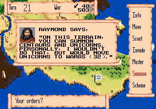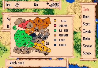 Bahamut SenkiSource code on GithubFor 2,000 years did the peace brought to Bahamut by the royal line of Pholia last; but no more. The skies darken, the evil powers once banished return, calamities tear the land itself asunder -- and the "Age of Darkness" is at hand. As the world crumbles, eight rulers raise armies and war amongst themselves to decide the fate of the continent. None can say when or how the Age of Darkness will end, but amidst the chaos, there is one certainty: that the conflict can be done only when one Master stands alone above them all... Bahamut Senki (Record of the Bahamut War) is a 1991 turn-based strategy game by Sega for the Mega Drive. In it, up to four players take control of one of eight rulers in the fantasy setting of Bahamut, raise armies, and battle AI opponents and each other until one faction emerges victorious. It's a very complex and advanced game for its time, featuring three rulesets of varying depth, adjustable difficulty, and three different levels of simulation: high-level political management, tactical battles (in both hex-based and simplified variants), and real-time action-based combat between individual units. This patch fully translates into English both the game itself and its two accompanying instruction manuals, which are essential to understanding how to play. See the readme included in the download for more information.