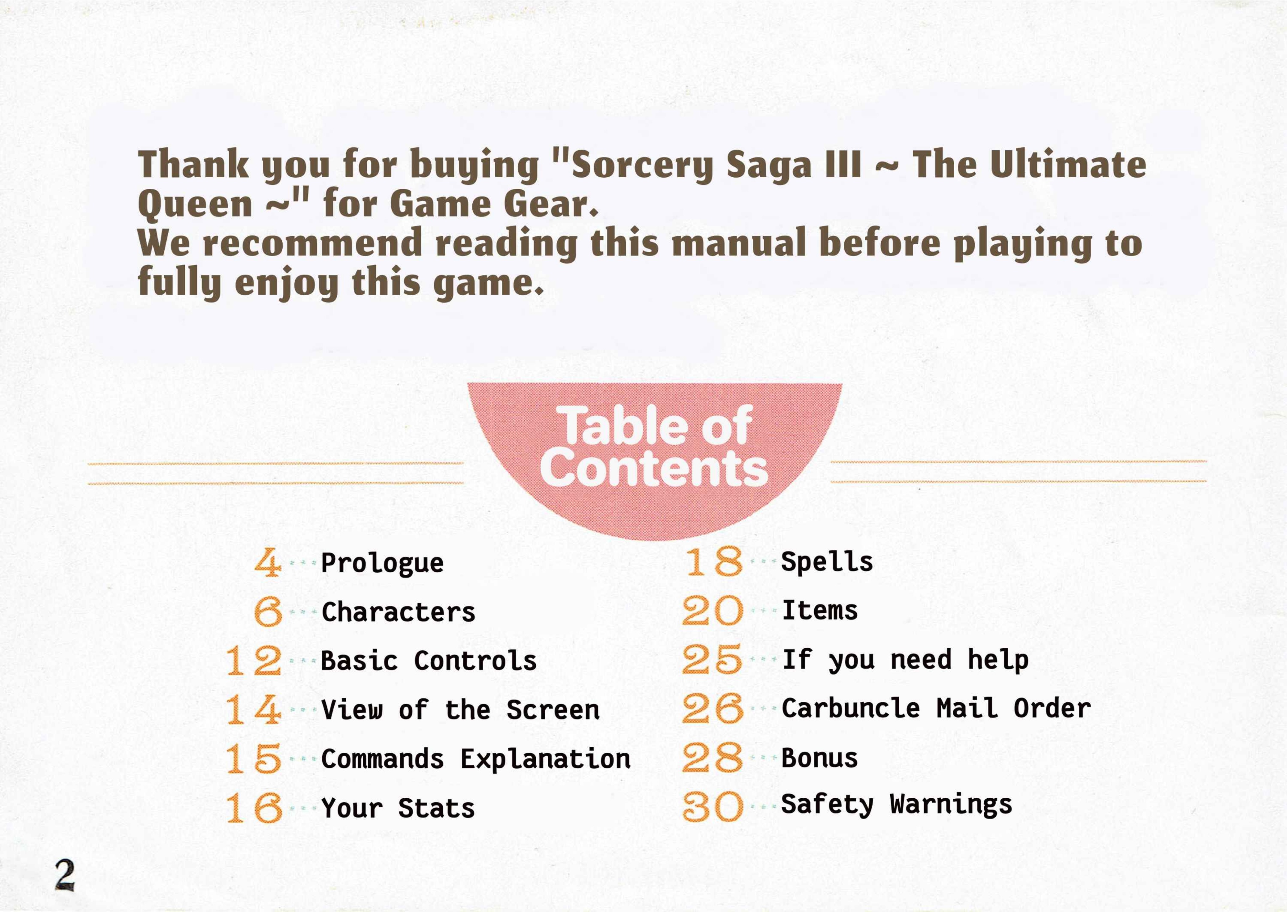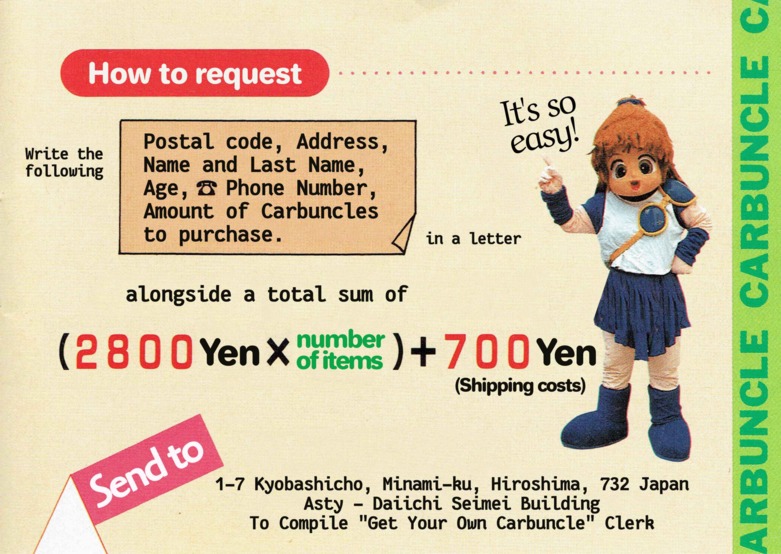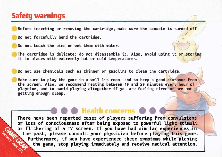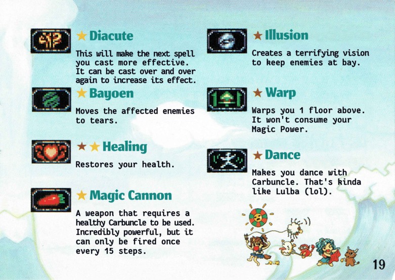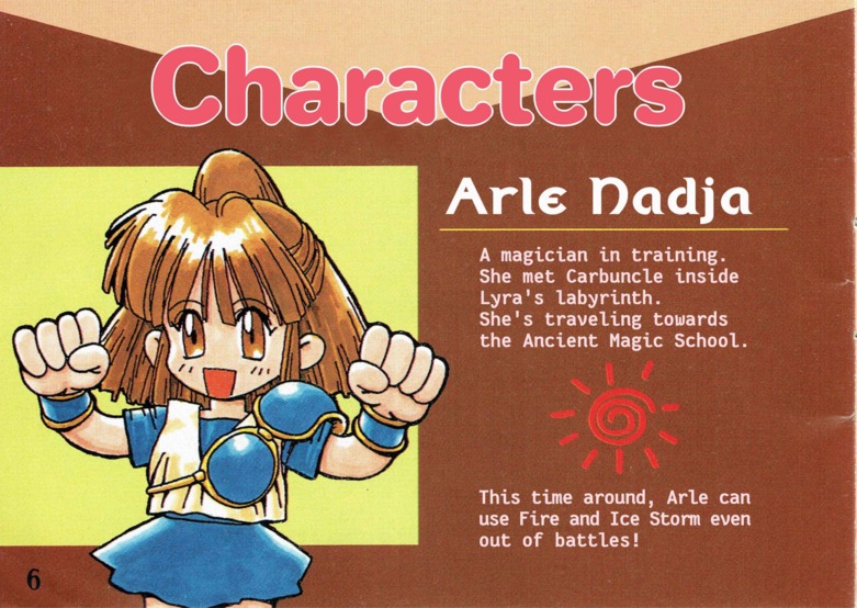 Madou Monogatari III User ManualAfter doing such amazing work on the Moldorian manual, Novyal has pulled off another scanslation tour-de-force: single-handedly cleaning, editing, and typesetting the entire manual for Madou Monogatari III! I think I speak for everyone involved in our translation project when I say we were absolutely floored with the results. So, now you can enjoy another beautiful Japanese user manual in English, just as it was meant to be experienced! It's got everything, down to the Carbuncle plushie order forms Thanks again to Sega Retro for providing the original high-quality manual scans. The translated images appear below, or you can download the whole thing as a PDF: Bulk download of the entire manual in PDF format You may also be interested in the original untranslated manual, available at Sega Retro. Manual Translation Credits