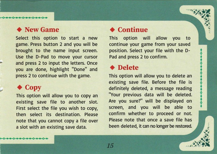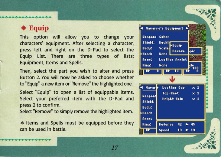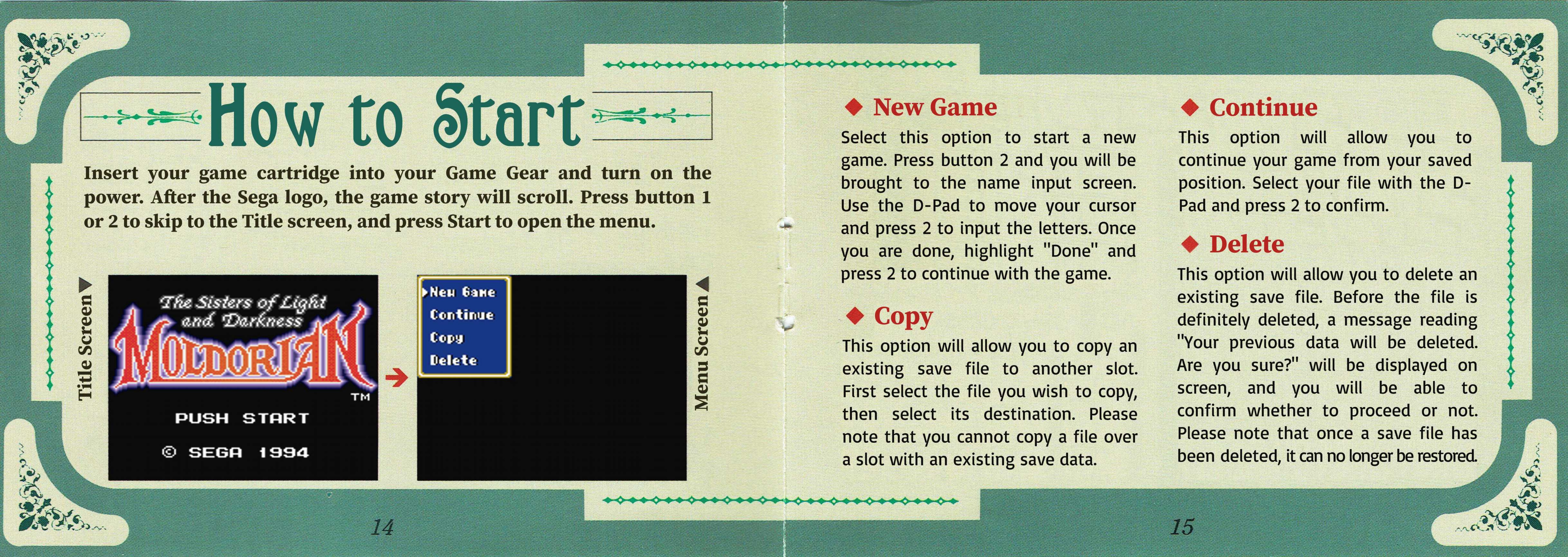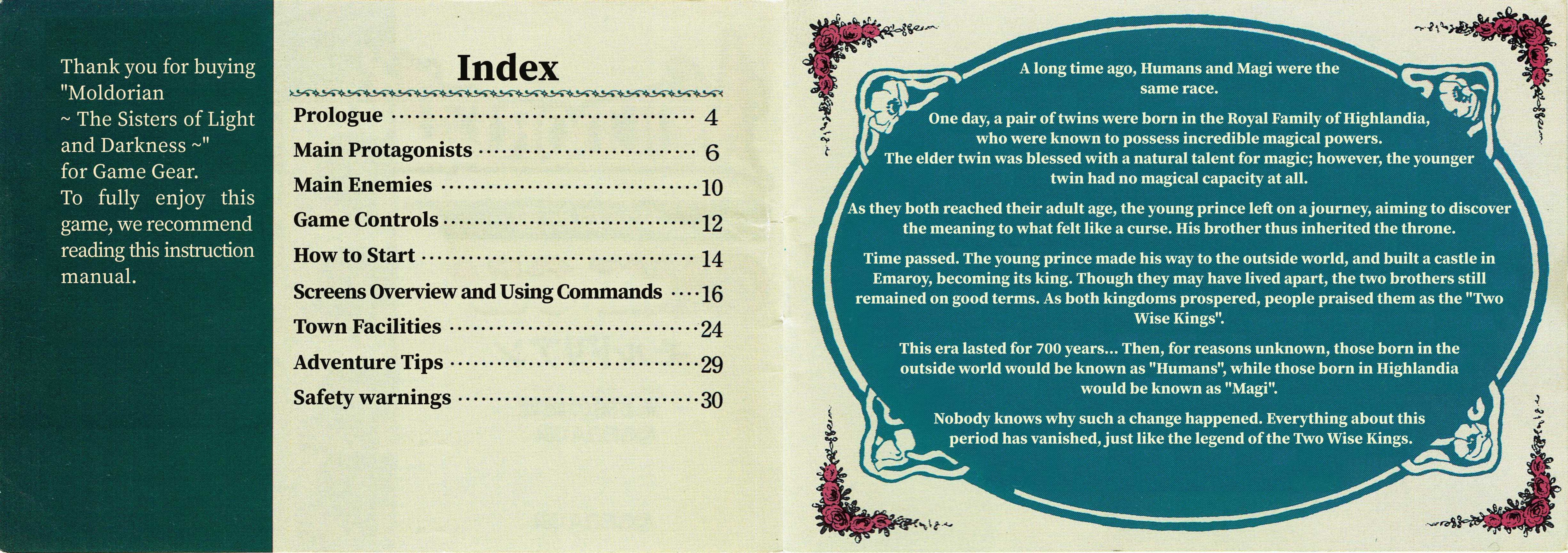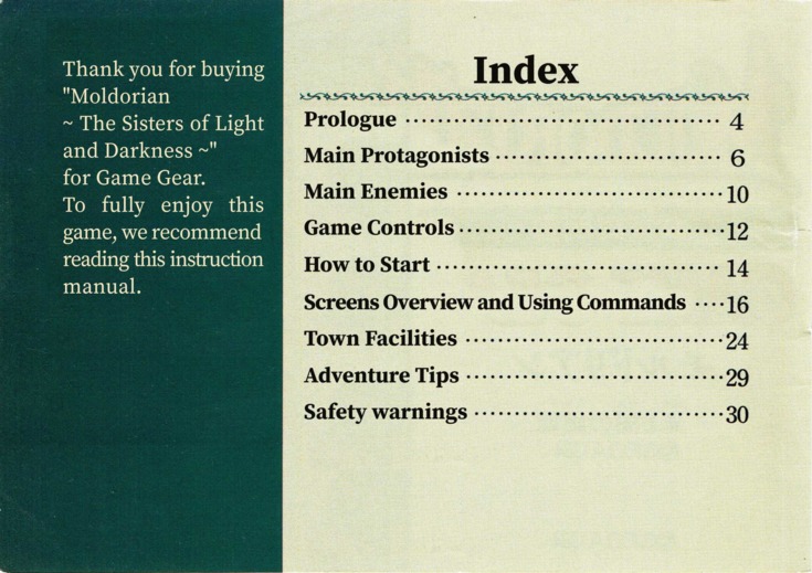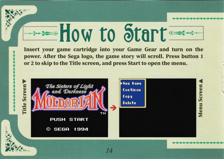 Moldorian User ManualSome time after we released our translation patch for Moldorian: Hikari to Yami no Sister, which included a text-only translation of the game manual, we were contacted by Novyal, a scanslator who offered to put together a proper English edition of the manual. We were totally blown away by the offer and happily leapt for it. Thanks to Novyal's hard work, and the high-resolution scans provided by the good folks at Sega Retro, we can now offer this gorgeous full-color English-language manual! The translated images appear below, or you can download the whole thing as a PDF: Bulk download of the entire manual in PDF format Alternate "Japanese screenshots" PDF – This is an alternate version of the manual that leaves in the original Japanese screenshots so that the translated manual isn't tied directly to our patch. The content is otherwise identical. You may also be interested in the original untranslated manual, available at Sega Retro. Manual Translation Credits