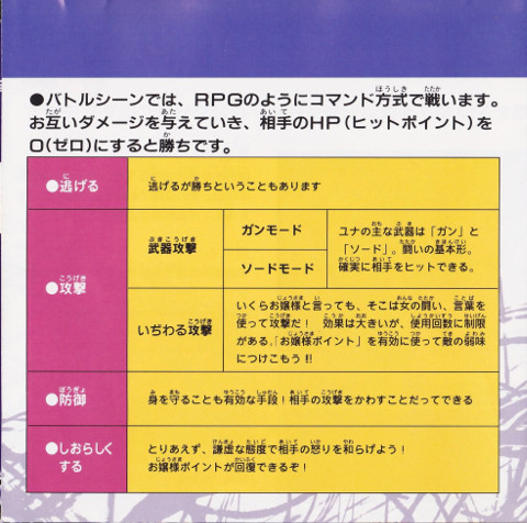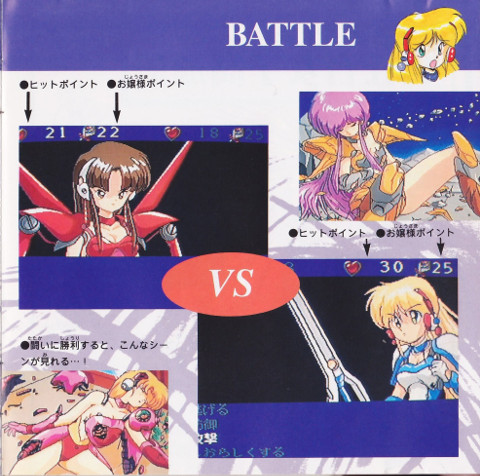 | Verbal Attack | No matter how ladylike they may seem, in a battle between women, harsh language is sure to be used! It’s highly effective, but has a limited number of uses. Make good use of your “Fraulein Points” to take advantage of your opponent’s weaknesses!! | ||